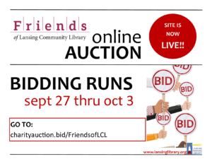 The Friends of Lansing Community Library’s Online Auction site is now LIVE! This means you can have a look at all of the items that will be available to bid on when bidding opens on Monday, September 27th! You will be asked to “register” with the auction site in order to see the auction catalog, however you do not have to share a credit card unless you choose to place a bid.
