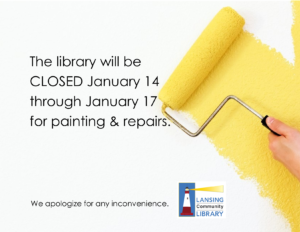 Painting & Repairs Closed Dates The Library will be CLOSED Friday, January 14th through Monday, January 17th for painting and repairs. Michelle Calupca2022-01-13T13:21:50-05:00January 13th, 2022|Special Announcement| Share This! FacebookXWhatsAppPinterestEmail Related Posts Upcoming LCL Holiday Hours December 12th, 2025 | 0 Comments LCL Important Update! October 9th, 2025 | 0 Comments Celebrate with Costumes & Cocktails in Support of the Lansing Community Library September 9th, 2025 Lansing Community, You Showed Up and Voted—Thank You! April 24th, 2025