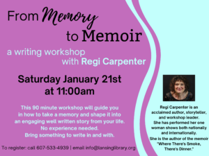 This 90 minute workshop will guide you in how to take a memory and shape it into an engaging well written story from your life.