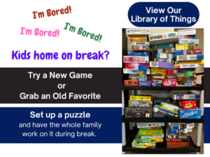 We have lots of fun things to borrow to help make your “family together time” over school break more enjoyable! Check out our Library of Things.