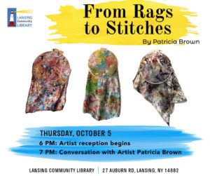 Come out and join us for an evening of art and conversation with Patricia Brown at her From Rags to Stitches show! We’ll be gathering at 6 PM for an artist reception, and then at 7 PM, we’ll have a conversation with Patricia Brown about her work and her creative process. The event will be held at the Lansing Community Library at 27 Auburn Road, Lansing, NY.