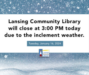 The Lansing Community Library will close at 3:00 PM today due to the inclement weather.