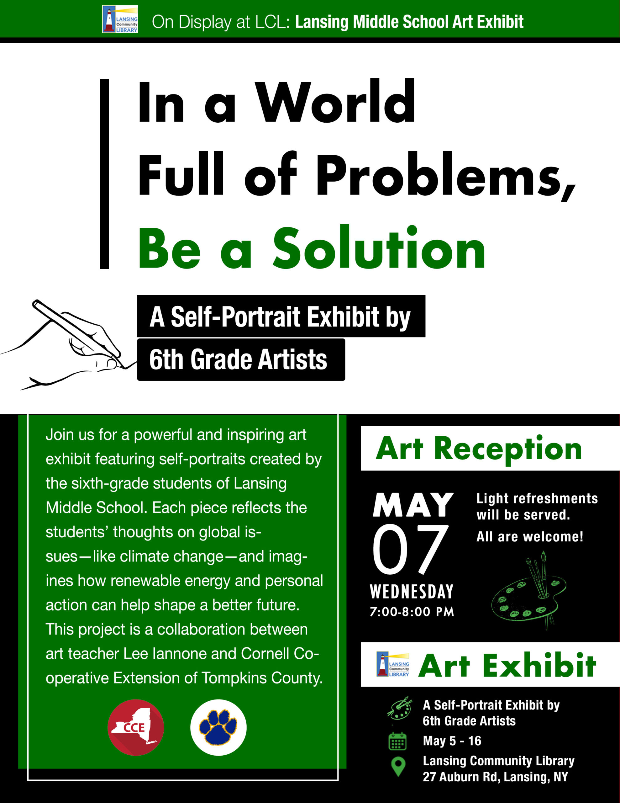 We’re thrilled to host an inspiring new exhibit featuring self-portraits created by the sixth-grade students of Lansing Middle School. Each piece expresses the students’ thoughts on pressing global issues—like climate change—and their visions for a better future through renewable energy and personal action.