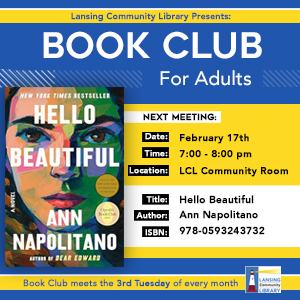 LCL Book Club for Adults – February Meeting For our February meet-up, we’ll be reading Hello Beautiful by ... 17 Feb 7:00 pm - 8:00 pm Lansing Community Library27 Auburn Road, Lansing, NY