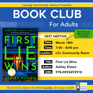 LCL Book Club for Adults – March Meeting For our March Book Club, we’re reading First Lie Wins by Ashley Elston. ... 18 Mar 7:00 pm - 8:00 pm Lansing Community Library27 Auburn Road, Lansing, NY