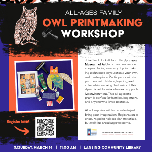LCL All-ages Family Owl Printmaking Workshop Join Carol Hockett from the Johnson Museum of Art for ... 14 Mar 11:00 am - 12:00 pm Lansing Community Library27 Auburn Road, Lansing, NY