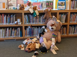 The readers and their stuffed animal friends started the evening off with a storytime led by Ms. Madelyn Lombardo, Lansing Central School District’s Buckley Elementary Teacher-Librarian. The children, adults, and animals alike enjoyed the stories – thank you so much, Ms. Lombardo! The stuffed animals stayed at the library overnight and had a “wild” time (see slideshow below). They romped through the library, played, read books, and finally, put on their sleep masks and bedded down for the night. In the morning, the animals were happy to be picked up by their readers so they could show them their individualized book of sleepover memories.