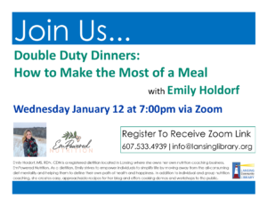 Join us on Wednesday, January 12th at 7:00pm for the first program in a three-month series about food and nutrition. In January, we’ll have Emily Holdorf, registered dietitian. In February, Eric Lindstrom, author of The Skeptical Vegan, will discuss his book with us. And in March, Sarah Curless, SNAP-Ed New York Nutrition Educator for Tompkins County, will share some recipes and tips for healthy eating. All three programs will be held via Zoom.