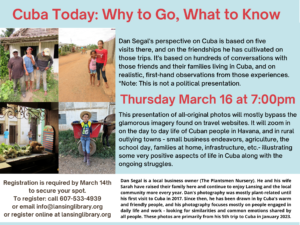 Join Dan Segal on Thursday, March 16th at 7:00pm at the Lansing Community Library as he shares his personal photographs that show a day in the life of the Cuban people.