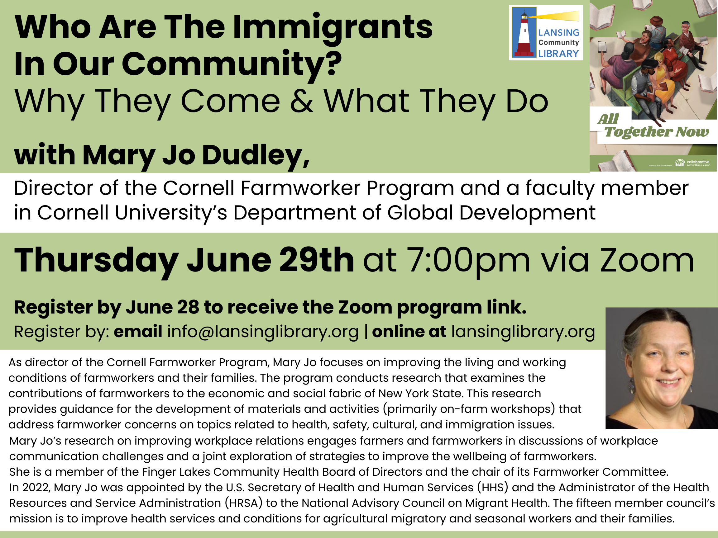 The Lansing Community Library will be hosting a Zoom presentation with Mary Jo Dudley, the Director of the Cornell Farmworker Program and a faculty member in Cornell University’s Department of Global Development. She will help answer the question – Who Are The Immigrants In Our Community? and explain Why They Come & What They Do. This presentation is part of our 2023 Summer Reading Program which is focused on the theme “All Together Now.” Bring your curiosity and compassion and learn more about your neighbors’ lives, families, work, and cultures.
