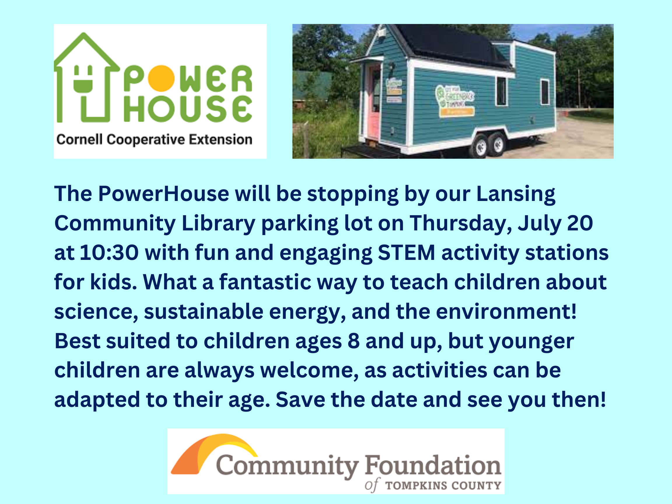 The Cornell Cooperative Extension PowerHouse will be stopping by our Lansing Community Library parking lot on Thursday, July 20th at 10:30am with fun and engaging STEM activity stations for kids.