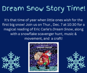 It’s that time of year when little ones wish for the first big snow! Join Ms. Shelley for a magical reading of Eric Carle’s Dream Snow, along with a snowflake scavenger hunt, music & movement, and a craft!