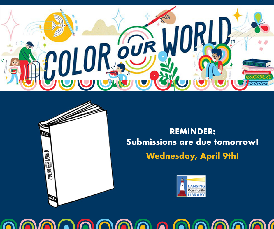 Just a reminder—submissions are due by tomorrow! The library will be open from 10:00 AM to 6:00 PM on Wednesday, April 9th. Drop off your submission for a chance to be featured in this summer’s reading program!