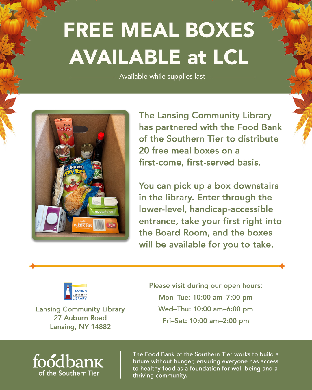 The Lansing Community Library has partnered with the Food Bank of the Southern Tier to distribute 20 free meal boxes on a first-come, first-served basis for those in need. You can pick up a box downstairs in the library. Enter through the lower-level, handicap-accessible entrance, take your first right into the Board Room, and the boxes will be available for you to take.