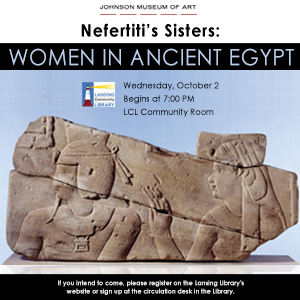 Join Carol Hockett, Hintsa Family Manager of School and Family Programs at the Johnson Museum of Art, for this slide-illustrated talk on women in ancient Egypt. Through sculpture, tomb paintings, and reliefs, we’ll cover daily life and religion, the afterlife, and mummification. From the goddess Isis to the roles of wife and mother, we’ll explore the many roles played by Egyptian women.